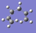 Usually, the diene is electron rich, and hence has a high-energy HOMO, while the dienophile, is electron poor, and hence has a low-energy LUMO, as this combination gives a better overlap in the transition state[18]. However, in this case, both, the diene and the dienophile, cis-butadiene and ethylene, respectively, are electron rich. Therefore, both HOMOs and both LUMOs are close in energy. As a result, there will not be much energy gain in interacting cis-butadiene’s HOMO with ethylene’s LUMO (versus cis-butadiene’s LUMO with ethylene’s HOMO). Energies of the relative Frontier Orbitals were inspected, and it turns out that, in fact, the energy difference [LUMO(cis-butadiene)-HOMO(ethylene)] is slightly smaller than [HOMO(cis-butadiene)-LUMO(ethylene)] (0.23654 a.u. compared to 0.24617 a.u.) (as illustrated by the table above).