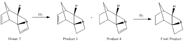 Therefore, the dimerization goes through a kinetic pathway, whereas hydrogenation goes through a thermodynamic one and the formation of Product 4 is expected to happen before Product 3 before both alkenes are hydrogenated.