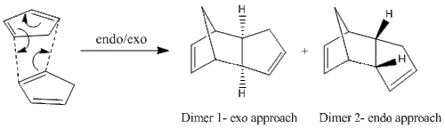 The high stereospecificity of the Diels-Alder can be further observed in the dimerization reaction of two cyclopentadiene molecules. Despite being aromatic (2π e-, =4n+2), it shows unusual reactivity compared to other neutral aromatics such as benzene etc. due to its molecular orbitals. The classical/mechanical focus of Alligner’s MM2 calculations appear to be sufficient for giving a reasonable explanation the reaction, however the orbital theory behind the dimerization should also be noted for definitive results.