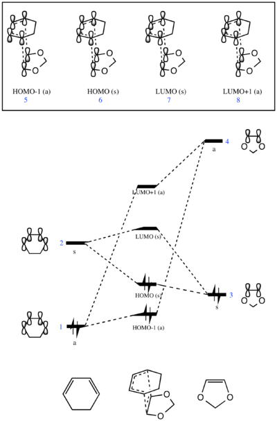 The MO diagram shows that the LUMO of cyclohexadiene combines with the HOMO of 1,3-dioxole in-phase and out-of-phase to generate the HOMO and LUMO of the transition state, respectively. The HOMO of cyclohexadiene also combines with the LUMO of 1,3-dioxole in-phase (a stabilising interaction) to generate HOMO-1 and out of phase (a destabilising interaction) to generate LUMO+1.
