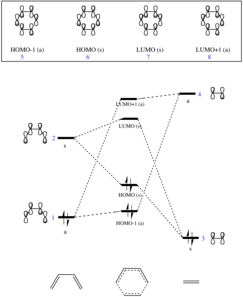 The MO diagram shows that the LUMO of 1,3-butadiene combines with the HOMO of ethene in-phase and out-of-phase to generate the HOMO and LUMO of the transition state, respectively. The HOMO of 1,3-butadiene also combines with the LUMO of ethene in-phase (a stabilising interaction) to generate HOMO-1 and out of phase (a destabilising interaction) to generate LUMO+1.