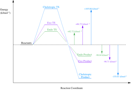 The 'Thermochemistry Data' were used to calculate the activation and reaction energies of each of the three pathways, see Table 5. The endo pathway has the smallest activation energy, therefore it is kinetically favoured (thus the endo product is the kinetic product). The endo transition state could be lower in energy because there is reduced steric clash. It may also be stabilised by a secondary orbital overlap between the pi systems of the xylylene and the oxygen atoms from SO2. Since these factors stabilise the transition state, they result in a lower activation barrier.
