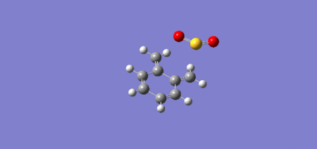 In part 3, the competition of three different reacting pathways was investigated. SO2 can react with o-xylylene in a Diels Alder fashion, with one S atom and one O atom as part of a 6 membered ring, or in a cheletropic fashion, with just the S atom as part of a 5 membered ring. It was found that the endo product is kinetically favoured for this reaction since it has the smallest activation energy, however the thermodynamically favoured product is the cheletropic molecule. Although the cheletropic transiton state is disfavoured in terms of kinetics (due to the strained 5 membered ring), it is the most thermodynamically stable due to its strong and unreactive S=O bonds.