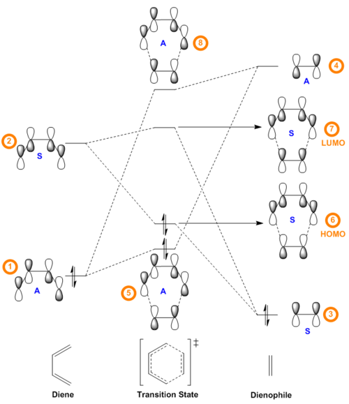 The Jmol applets in Table 2 show the Gaussian-calculated HOMO and LUMO of both butadiene and ethylene as well as the resulting four MOs produced for the transition state. The relative energies of the orbitals of butadiene and ethylene were determined by optimising the structures of reactants that resulted from the IRC calculations on the transition state and subsequently running a single point energy calculation at PM6 level. The MO diagram showed in Figure 4 was constructed using both the molecular orbitals and the energy values obtained using Gaussian. In [4+2] cycloaddition reactions, there is only one persistent symmetry element, a mirror plane, so all molecular orbitals are either symmetric (S) or antisymmetric (A) with respect to it.[6] Analysis of the MO diagram in Figure 4 reveals that the HOMO and LUMO of the transition structure are a result of the interaction between the HOMO of ethylene and the LUMO of butadiene, both of which are symmetric. During a pericyclic process there is a conservation of orbital symmetry, a notion introduced by Woodward and Hoffman, thus the transition state HOMO and LUMO must be symmetric, which can be further confirmed by visual inspection of MOs 6 and 7 in Table 2. [6] Similarly, the antisymmetric HOMO-1 and LUMO+1 of the TS are given by the interaction between the HOMO of butadiene and the LUMO of ethylene, which are both antisymmetric. It can be therefore concluded that only MOs of the same symmetry can interact to form a new bonding/anti-bonding pair. The fact that only symmetric-symmetric (S-S) and antisymmetric-antisymmetric (A-A) orbital interactions are allowed can be rationalised by considering the overlap integral SAB of the orbitals: in fact, the orbital overlap integral is non-zero for symmetric-symmetric and antisymmetric-antisymmetric orbital interactions, whereas it is zero for interactions of orbitals of the same symmetry.
