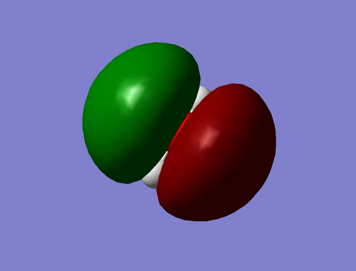 In Figure 22 it is possible to observe the bonding MO (#3 in Figure 17) generated from the mixing of the 2py Atomic Orbital and the Hydrogen σ MO. On the other hand, Figure 23 shows the corresponding antibonding MO (#7 in Figure 17) which is instead given by the interaction of the Oxygen 2py orbital with the Hydrogen σ* MO.