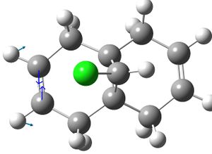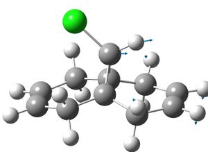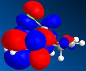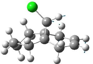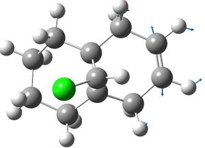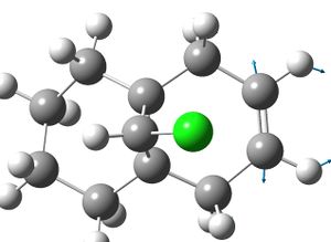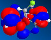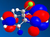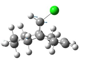 The diene pictured is reported[5] to react with electrophilic reaction selectively on the double bond exo to the chlorine atom. In this section computational modelling of the molecular orbitals and stretching frequencies of molecule are used to explain this selectivity.