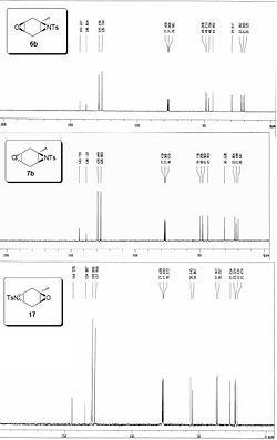 Computational models of the three products' spectra[8] were created using Gaussian (see fig5). The peaks above 120ppm represent the tosyl carbons and are not of interest. As expected the aziridine peaks show a doublet for the epoxidation/aziridination product and a complex multiplet for the aziridination/epoxidation isomers. This is in agreement with the experimental spectra (fig 6) however there is a noticeable difference in the chemical shifts.