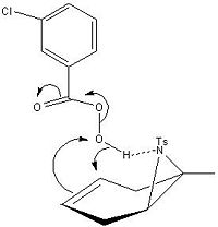 The MM2 models used in the regiochemistry section show that the aziridination/epoxidation products adopt a conformer that has the methyl group within the plane of the ring. It is therefore clear that the steric effect of te methyl is negligble compared to than of the epoxide/aziridine which both partially obstruct attack on one face of the molecule. However experimental result shows a 65:35 ratio in favour of a cis product when the aziridination is followed by epoxidation. Sureshkumar et al proposed a mechanism whereby the incoming mCPBA coordinates to the aziridine nitrogen (fig8) thereby directing the epoxide oxygen to the same face. Similar cases[12] [13]have been reported where mCPBA coordinates to an amine at C3, so it is likely that this is he case.
