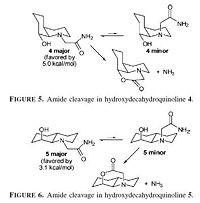 The results from molcecular modelling show that for both starting materials the equatorial form is lower in energy. Substituted cyclohexanes are known to favour the equatorial conformer as diaxial compressions are minimised.For the OH and peptide groups to react with one another they must be correctly orrientated (i.e. both axial or both equatorial). In the case of A this orienation is the lower energy conformer and hence will form the majority of the starting material, giving rapid hydrolysis of the peptide bond. However for B the necessary orienation is higher in energy and therefore provides an energy barrier which must be overcome before the reaction can take place, causing hydrolysis to take place more slowly at room temperature.