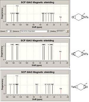 It has recenetly been reported[7] aziridino epoxides can be synthesised both regio and stereoselectively from cyclic dienes. The experimental method reported involves epoxidation using mCPBA and Sharpless aziridination (CAT, PTAB) but it is the order in which these two steps are carried out that determines the regiochemistry of the product. This section attempts to use computational modelling to predict the 13C NMR spectra for both regio isomers and to explain both the regio and stereoselectivity.