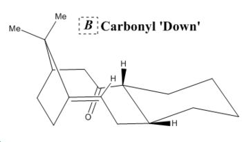 Stereochemistry of carbonyl addition is dependant on the most stable isomer which is formed in abundance prior to reaction. This atropisomer is C with the carbonyl facing 'down' in the opposite direction to the bridging carbon, which by visual representation appears a lot more natural structure. This isomer is produced in greater quantities and so therefore produces enantioselective carbonyl addition products in neutral pH conditions. The breakdown of energy contributions shown in table 3 shows that C is significantly more thermodynamically stable to the processes of stretching and bending which is indicative of it's more spatially efficient structure with a smaller energetic barrier to elongation and bending through the centre of the molecule as visualised in the table above. In B due to the unnatural conformation the cyclohexyl group is forced into a twist boat conformation which increases the destabilisation from 1,3-diaxial interactions, which are encapsulated in the 1,4-Van der Waals energy contribution.