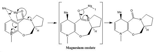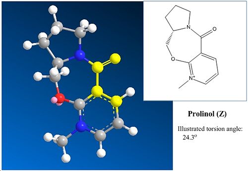 In the reaction of prolinol Z, it can be seen that a torsion angle is made of 24.3o between the carbonyl and the attacked position on the pyridyl ring. In this case it can be stated that the resulting methyl orientation is optically dependant on torsion angle produced by the carbonyl in respect to the aromatic ring as it can be seen that due to the intermediate enolate formation the methyl will attack at the face directed onto by enolate formation. The larger the torsion angle observed the greater the directing ability and the more stereoselectivity will be yielded. Although the carbonyl is not attached this is an example of neighbouring group participation. It is notable that there are two enantiomers of the starting reagent Z and it can be said that given the alternate enantiomer as electrophilic species the product would be formed with the opposite methyl orientation due to the negatively related torsion angle of the carbonyl and the aromatic ring in the alternative enantiomer Z' with respect to that observed in Z. This concept is illustrated in figure 5.