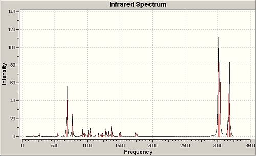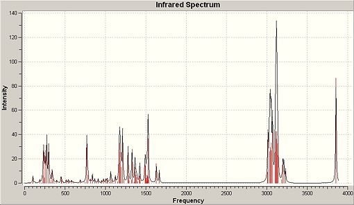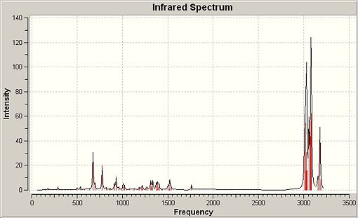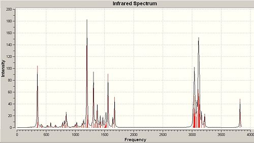 Overall the computation methods were shown to have significant limitations for the molecules o-NP and p-NP. There were significant successes however, and it was shown that in this case infrared analysis was the most applicable method to computationally produce results that would allow discrimination between the two products. Given a typical reaction, under the conditions stated in figure....., it could be proven that a mixture of both isomers was produced by means of peak analysis of the 'bending' OH peaks observed at various key areas of the spectrum on the basis of intensity and absolute peak wavenumber.