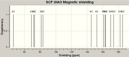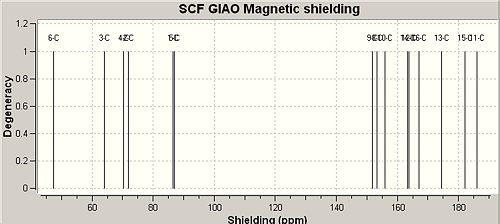 The poor ability of the GIAO method to incorporate heavy atoms and complex electronic effects such as aromaticity is exemplified by table 10 above. The result of these limitations is that the shielding of aromatics and alkyl carbon's respectively has been inverted to give results that show the opposite trends to the literature shifts. The literature shifts were obtained from the cited places and due to not being able to find literature 13 NMR shifts for o-NP the shifts were predicted by considering the products of fragmentation.