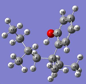 The most disappointing aspect of the procedure was the extremely poor prediction of the 13C NMR spectrum, although the likely reasons for its failings have been well referenced. Further work should seek to fragment o-NP and p-NP molecules into phenol and nonylphenol derivatives and repeat the GIAO approach to observe the accuracy of the predicted 13C NMR shifts for these derivative molecules. If this experiment was a success it would imply that the cause of the problem was the inclusion of two very different types of electronic consideration in one molecule, being aromaticity and highly branched alkane chains. It is possible that this could lead to improvement of the computational method in terms of the computational combination of these two types of electronic distribution. However a possible adverse effect of this proposed plan is the higher conformational flexibility that would be afforded to the nonyl alkyl chain derivative that may further increase conformational ambiguity, which is known to be a major cause of inaccurate NMR prediction.