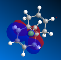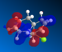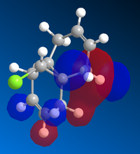 The molecule 12 has a symmetry of Cs. [15] Only LUMO+1 orbital is symmetrical, lying in the same mirror plane of the molecule. As seen from the above orbitals, most of the electron density is away from the green Cl atom as a result of electrostatic repulsion. The highest electron density is shown on HOMO -1, which implies that is more favoured as a site by electrophilic attack. Therefore, the monoalkene formed in such a way shown below.