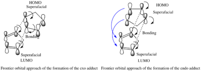 The exo adduct is resulted from both σ bonds forming on the bottom face of the diene and both σ bonds forming on the top face of the dienophile, while the endo one is resulted from both σ bonds forming on the bottom faces on the diene and dienophile.[2] This is illustated in Figure 1. It can be seen that apart from the formations of two new σ bonds, at the back of endo dimer, there's also bonding interaction(shown in blue