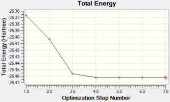The total energy curve shows that the BH3 molecule travels along its potential energy surface until it reaches the minimum structure position. The root mean square gradient graph shows the gradient is gradually decreasing when approaching to the optimised position. The potential energy curve could be obtained from Born-Oppenheimer Approximation. In a diatomic system, if two nuclei are too close to each other, they will repel each other and the energy goes up. As the bond length stretches, it reaches the lowest potential energy and obtains the optimised position. The slope at this point should be very close to zero. As the bond length stretches further, the interaction between the nuclear and electron decreases and the energy goes up again until it reaches the plateau, resulting in the dissociation of molecule.