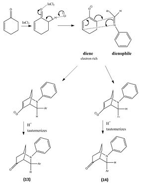 The reaction involved reacting with at room temperature for 24 hours, which produced molecule 13 and 14 in a hetero Diels-Alder reaction, however within the literature they envisaged the formation of phenanthridinone derivatives 15 and 16. This happened due to chemioselectivity within the first step of the mechanism by the indium trichloride (InCl3) coordinating strongly with the cyclohexadienolate ion. This lead to the cyclohex-2-enone becoming electron rich and therefore reacting as the diene and the imine acting as the dienophile, which was the opposite to the proposed roles of both reactants.