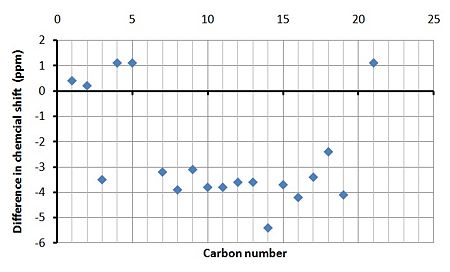 By studying the graphs showing the the difference in the calculated and experimental chemical shifts it it clear that the majority of the calculated peaks have a lower chemical shift in both cases. This will most likely be due to other conformers/chemicals within the experimental NMR sample and that the calculations are approximations and therefore not perfect.