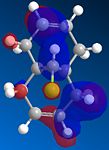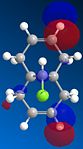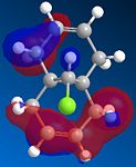 From studying the HOMO orbital below it can be seen that the largest amount of electron density is on the syn-alkene, which makes it more nucleophilic than the alternative site site of attack, the electron poor anti-alkene. Since dichlorocarbene is an electrophile it will therefore attack the syn-alkene and not the anti-alkene. In addition to this factor there is a stabilising anti-periplanar interaction amongst the anti-alkene π orbital (HOMO-1) and C-Cl σ* orbital (LUMO+1) which leads to the anti-alkene π orbital to lower its energy relative to the syn-alkene π orbital (HOMO) by 0.08eV[5]. From this it can be deduced that the anti-alkene π orbital is less reactive by it being thermodynamically more stable to that of the syn-alkene π orbital and therefore explains the regioselectivity above.