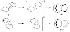 Cyclopentadiene dimerises to form a dimer via the mechanism of the [π4+π2] Diels-Alder cycloaddition reaction (shown on the right). This can theoretically result in either the exo product (molecule 1) or the endo product (molecule 2).