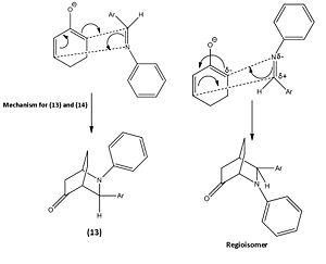 From this reaction two other possible regioisomers were theoretically possible however none were formed due to how the mechanism took place. The image below shows the other possible mechanism which would lead to the other 2 regioisomers for this reaction. However the 1,2-alkene bond on the cyclohexadienolate ion is highly delta negative due to the O- donating a significant amount of electron density to it and therefore the electrons within the C=N π bond attacking 1,2-alkene is not likely. This argument is further strengthened by the 1,2-alkene having a larger amount of electron density in the HOMO compared to the 5,6-alkene, which is the other possible site the cyclohexadienolate ion could attack the imine from. A final factor to why the alternative reaction does not take place is due to the carbon within the C=N bond having more electron density in the LUMO to that of the nitrogen. Thus makes the carbon a more likely place for the electrons to attack.
