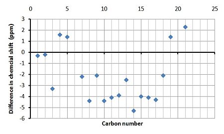 Carbon number | Calculated chemical shift (ppm) | Experimental chemical shift[7] (ppm) |