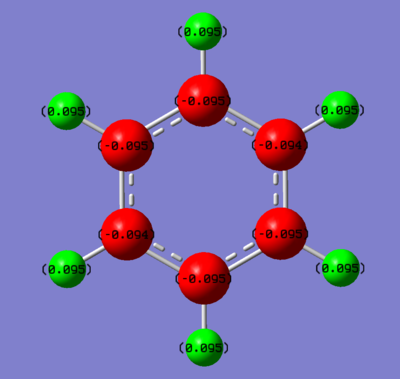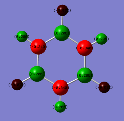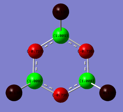 The charge distribution on BH3 was calculated using DFT/B3LYP with the STO 3-21g basis set. To the right is the representation of the charge distribution. The Boron atom is green as it has a positive charge of 0.33161, and the hydrogen atoms are red as they have a negative charge of -0.11054 each. The net charge here is 0 as the molecule is completely symmetrical.