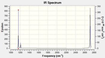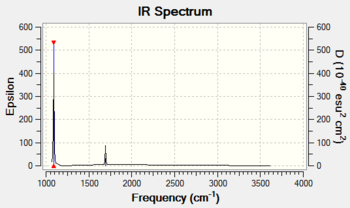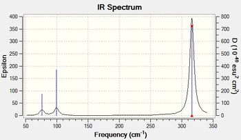 The lowest real normal mode is found at 76.39 cm-1. Similar to the spectrum for BH3, only three peaks are found. This is again due to the fact that there are two degenerate sets of vibrations and a totally symmetric A1" vibration which is not IR active.