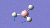 All the hydrogen atoms are oscillating in the plane of the molecule; however, one is oscillating in the opposite direction to the others and with greater magnitude. The boron atom is also oscillating slightly in the plane of the molecule.