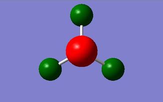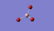The calculated B-Br bond distance and Br-B-Br bond angle are shown in the table to the left. The B-Br bond distance of gaseous BBr3 has been reported in literature as 1.896 Å;[4] this is similar to the value obtained in this optimisation. The Br-B-Br bond angle was found to be 120° as expected for a trigonal planar molecule.