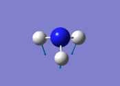 Two of the hydrogen atoms show asymmetric stretching whilst the other remains completely stationary. This causes the nitrogen atom to oscillate slightly.
