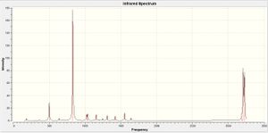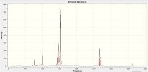 In this spectrum there are only 3 observable peaks despite there being 6 vibrational modes. As the table above shows, modes 2 and 4 and 5 and 6, have the same vibrational frequency as each other. As such, the peaks arising at approximately 1200cm-1 and 2700cm-1 are a result of combined IR emissions from 2 vibrational modes at the same frequency thus giving rise to combined readings on the spectrometer. There is no peak observed at approximately 2600cm-1 corresponding to the fourth vibrational mode because this mode is not IR active. For a molecule or bond to be IR active the corresponding vibration must result in a change in overall dipole moment. Because the fourth vibration is completely symmetric (as defined by its symmetry label) the dipole moment is unchanged upon bond stretching; it is therefore not IR active and does not give rise to a peak in the spectrum.