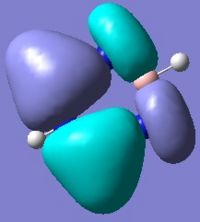 This data illustrates the fact that there is a build up of electron density and charge on the Nitrogen atoms as shown by the relatively large negative value whereas at the Boron atoms there is a distinct electron deficiency and corresponding positive charge (again relatively large). Whilst the charges of the Hydrogen atoms are much smaller the sign of the values supports the fact that the Nitrogen atoms are electronegative and the Boron atoms somewhat electropositive in this molecule. This correlates with the fact that the Nitrogen atoms are Lewis basic (electron rich) and each contain a lone pair-filled p-orbital whereas the Boron atoms are Lewis acidic (electron deficient) and contain a vacant p-orbital. It is therefore reasonable to expect that electron delocalisation may be observed where the Nitrogen atoms may donate electrons into the vacant Boronic p-orbitals. The typical donor-acceptor molecular orbital diagram has been illustrated below.