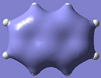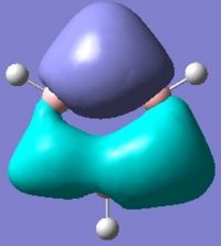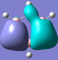For comparison, the molecular orbitals of Benzene were briefly looked at. The molecule was first optimised using the MP2 method and 6-311G basis set (http://hdl.handle.net/10042/to-5861) and then a frequency calculation was run using the same method and basis set (http://hdl.handle.net/10042/to-5864). Molecular orbitals which are very similar in appearance to those of Borazine (see above) were also observed in Benzene. It also worth noting that all of the occupied molecular orbitals of Borazine are bonding overall with energies lower than the non-bonding level (i.e. negative energy values); the HOMO resides just below the non-bonding level and the LUMO slightly above it. It's a similar case in Benzene where all of its occupied MOs are also bonding overall. In the case benzene however, there are also some unoccupied MOs just below the non-bonding level. These similarities are of course on account of the fact that Benzene and Borazine are isoelectronic to one another, the difference being that each Carbon atom contributes a single electron to the delocalised π-system.
