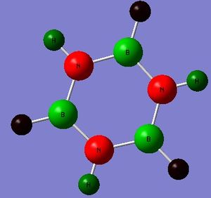 First, Borazine and it's properties are going to be studied. The molecule was drawn using GaussView 3.0 and then saved as an input file (.gjf). Due to the similarities between Borazine and Benzene on account of isoelectronics and aromaticity Borazine was drawn as a flat planar molecule like Benzene. The molecule was then submitted for an energy optimisation calculation. Because this molecule is relatively simple both in its size and geometry a medium-level basis set will be used; in this case the B3LYP (DFT) and LANL2DZ basis set was used. The electronic convergence was increased by typing "int=ultrafine scf=conver=9" into the additional keywords box of the Gaussian input window. These calculations ran to completion in a matter of minutes so it may be assumed that a higher basis set may be used for more accurate results without requiring too much computing time. The optimised molecule from before was optimised again, this time using the MP2 method and 6-311G basis set.