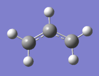 The allyl fragment CH2CHCH2 was drawn and optimized using the HF/3-21G level of theory. This is represented as Figure 4, below. This fragment possesses a C2v point group. The optimized allyl structure from the first calculation was pasted twice into the new window. The two allyl fragments were then adjusted to look similar to the chair transition state as given in Appendix 2. This is the guess chair transition state structure which is represented in Figure 5.