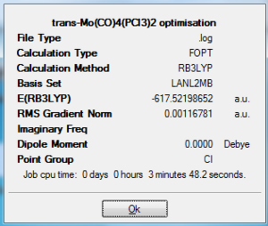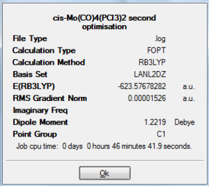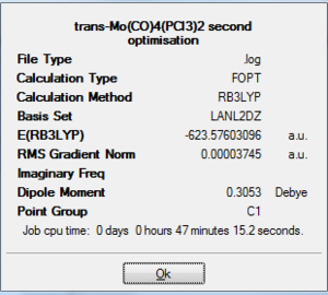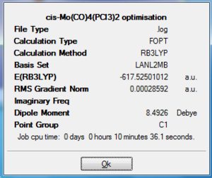 Both cis and trans isomers were optimised using FOPT calculation with a method of RB3LYP and a basis set of LANL2MB. The final energy of the two isomer are almost the same, yet cis-isomer is slightly more stable (by 7.9 kJ/mol). This can be seen as a result contributed by both electronic and steric factors, with the electronic effect dominating. For the trans-isomer, it is sterically less hindered. However, with CO ligands being such a strong π-acceptors, the trans effect for the CO ligands in the trans-isomer is large and as a result higher in energy. Cis-isomer has a smaller trans effect as there are only one pair of CO being trans in position to each other, hence it is lower in energy despite the two PCl3 is sterically hindered in space. Therefore, it is possible to alter the ordering of isomer structure by fine-tuning at the ligand groups PR3, changing the R affect the size of trans effect in the complex structure, where larger trans effect is more likely to give cis-isomer and lowering it give the trans-isomer. The trans-isomer has no dipole moment as expected from its symmetric structure, while cis-isomer has a dipole moment of 8.5 Debye. Both isomer has a RMS gradient smaller than 0.002, and by observing the log file we know that they have reached a global minimum. For the trans-isomer, Mo-C bond has a distance of 2.11 Angstroms and Mo-P is slightly longer with a distance of 2.48 Angstroms. In the case of cis-isomer, Mo-C is 2.06 Angstroms and Mo-P is 2.52 Angstroms in length.