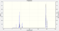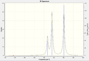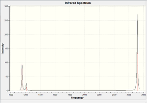 The result obtained matches with the prediction, where 6 vibration modes are identified. We might therefore expect 6 peaks in the IR spectrum of BH3, yet only 3 peaks shown up. This is due to the fact that there are two sets of degenerate vibration at 1210cm-1 and 2715cm-1, and one vibration being IR inactive(IR spectrum detects vibration by measuring any changes in dipole moments. Due to the symmetry of the BH3 molecule, there is no change in dipole moment observed from the a1' symmetric stretching. Hence it is not shown in the IR spectrum.) Comparing the literature value with the calculation, we would see error as large as 4.3% (2715cm-1). We would therefore consider the calculation as a tool to help identifying the number of vibration, but not to obtain the exact numerical value of the vibrations.