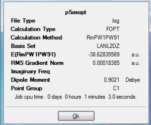 The two molecules are optimised with FODT calculation using RmPW1PW91method and a LANL2DZ basis set. The energy are lower for P6 (-38.99 a.u.) than P5As (-38.63 a.u.), this can be explained by the fact that the As is larger in size and has greater electron density and steric hinderince. The RMS Gradient for both molecules are close to zero. The dipole moment is 0 for P6 due to its symmetric geometry, while it is 0.9 Debye for P5As.
