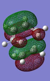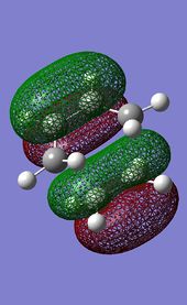 Interestingly, it can be seen that the two methods of calculation seem to have inversed the HOMO and HOMO-1 orbitals (ie: HOMO-1 from AM1 method corresponds to HOMO of DFT method and vice versa). The HOMO-1 (DFT)/ HOMO (AM1) corresponds to the orbital overlap between the two fragments required for the Diels-Alder reaction to proceed.