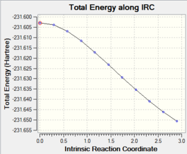 This seems to confirm that the right transition geometry has been computed. Since the reaction is not symmetrical (reactants ≠ products), the IRC calculation was repeated DOI:10042/to-13538 in the reverse direction (towards reactants), again re-optimising the last structure from the IRC calculation using the same level of theory as above DOI:10042/to-13537 .