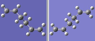 There are 51 intermediate geometries in the 50 step calculations, but 76 in the 250 step calculation. The structures resemble the gauche 3 conformation of 1,5-hexadiene, as shown on the right. The two 50 step calculations both have the same energy, which is greater than the energy of the 250 step calculation. They are still all higher in energy than the originally optimised structure at the start of the report however; -231.69266121 a.u. By taking the final geometry from the 250 step calculation and optimising it at the HF/3-21G level a structure with this energy is found however.