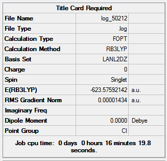 The final energy of the molecule is -91.22 Hartree, the RMS gradient is very close to zero (0.0000009) indicating the optimization has finished and the total time of the optimization is 14 seconds, a small amount of time was to be expected as the molecule is very simple. TlBr3 does not poses a dipole due to the D3h point group and means that all bromine atoms have the same orientation to the thallium; D3h point group retained after the optimization calculation as expected.