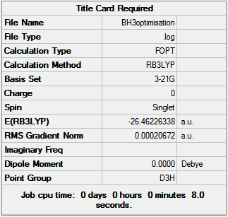 The final energy of the molecule is -26.46 Hartree, the RMS gradient is very close to zero (0.00021) indicating the optimization has finished and the total time of the optimization is 8 seconds, a small amount of time was to be expected as the molecule is very simple. BH3 does not poses a dipole due to the D3h point group and means that all hydrogen atoms have the same orientation to the boron.