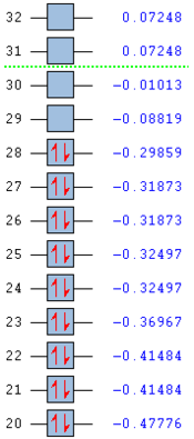 Molecular orbitals and their energies calculated using Gaussian via SCAN with the DFT/B3LYP method, 6-311G(d,p) basis set and considering natural bond orbitals. Figure 19 shows the MO's 20-31 graphically represented after being obtained from Gaussian and the energy of these orbitals.