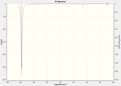 The total energy is the same as the optimized molecule, -91.22 Hartree and there is no change in the point group of TlBr3; so there is no change from the optimized TlBr3. Figure 12 shows the obtained IR spectrum and table 3 shows the calculated IR spectrum data both for TlBr3.