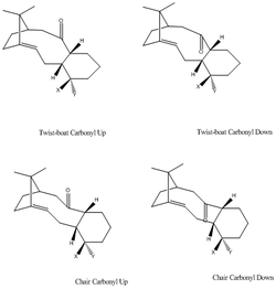 For this part of the module, the MM2 and MFF94 force fields were used to calculate the total energies of the different Taxol intermediates. Even though both of these models will be used, values cannot be compared as both models rely on a different set of approximations and parameters. MMFF94 force-field is a useful tool in this calculation as it was built with the exact purpose of dealing with larger molecules eg. complex drug molecules and proteins etc... As such, it gives the user an advantage when trying to calculate the total energy of the Taxol intermediates. Upon manipulating the geometry of the Taxol intermediates several times, it was concluded that there were a minimum of three different conformers for each product: twist-boat, chair and chair’ conformer.