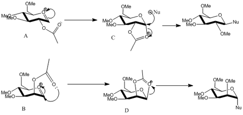 However, stereo-chemistry can be controlled to a certain extent by the Neighbouring Group Effect[8] (NGP). In the Fischer glycosidation reaction, once the departure of the leaving group (at the α-position) occurs, a cyclisation reaction occurs between the carbonyl of the β-acetate group and the α-carbon; the oxocarbenium ion (cationic intermediate) returns to its cyclic hemiacetal form. As the large protecting group only allows nucleophiles to attack from the opposite side, the stereo-chemistry is controlled to a large extent i.e. the control of formation of α- or β-anomer depends on the positioning of this acetate protecting group (either above or below the plane). The overall mechanism is shown below: